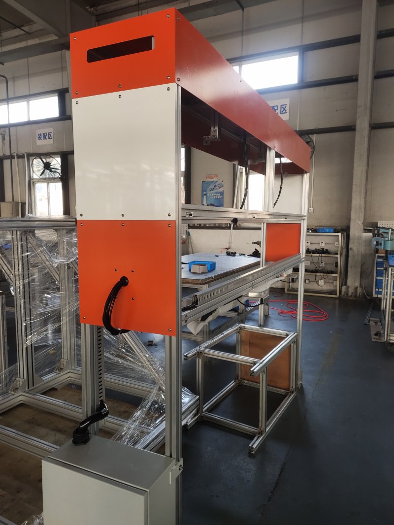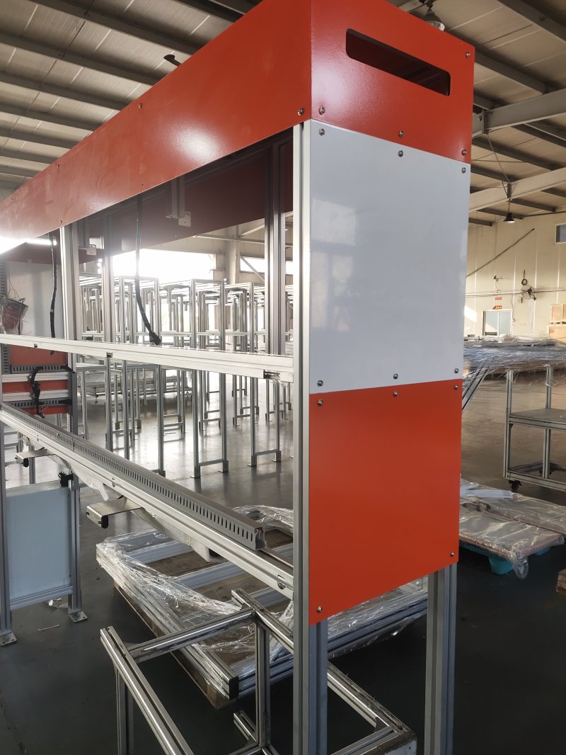 鋁型材設備機架主體由高強度鋁型材和鈑金件組合拼接而成,上部分為工作區域,下半部分為電器控制柜區域。工作區域可安裝電氣模組、傳感器設備等,下部電器柜區域安裝電控設備。